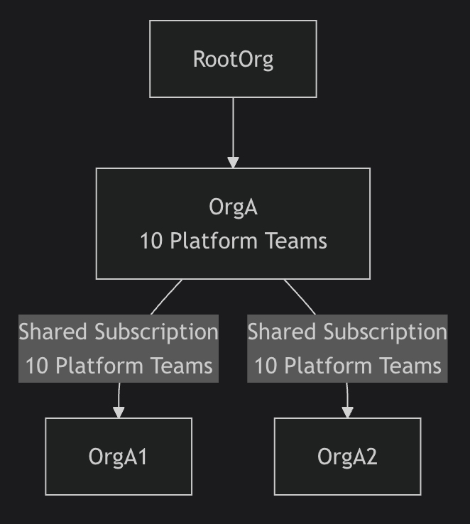 Scenario: If there is a free seat in OrgA's platform teams subscription, it can be assigned to a user in OrgA1 or OrgA2.