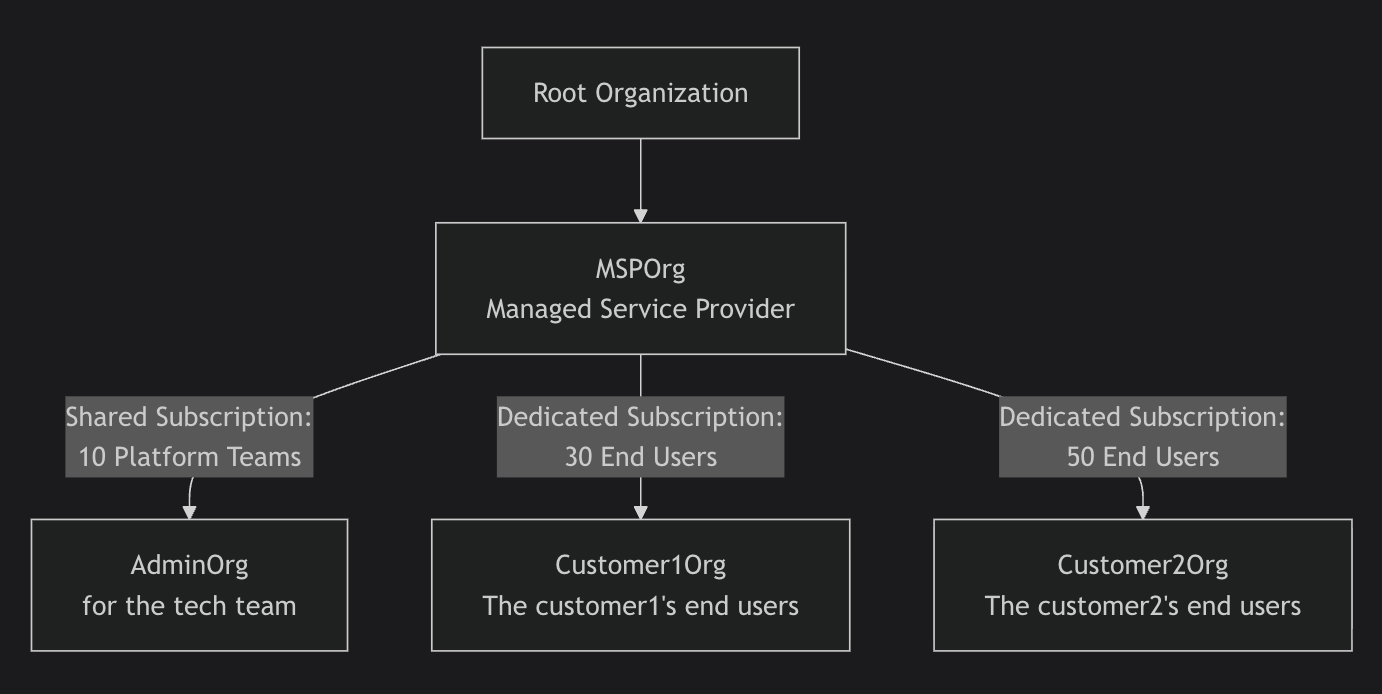 AdminOrg: 10 seats for their tech team (platform teams). Created under AdminOrg will share AdminOrg's subscription by default until a dedicated subscription is added.