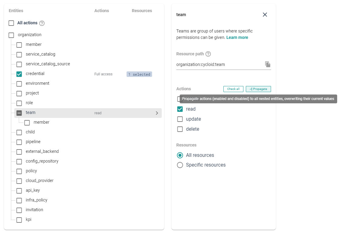 In entities with nested children you'll also find the "Propagate" button, which allows you to spread the actions down to all nested entities. This would obviously NOT spread specific resources, as they are specific of current entity.