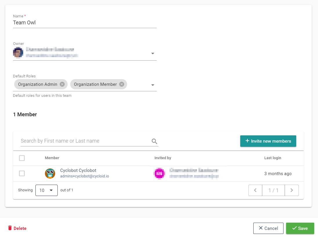 In this silly example the 'Cyclobot' account, which is admin of the organization, also gained the 'Organization Member' & 'Organization Owl' roles.
