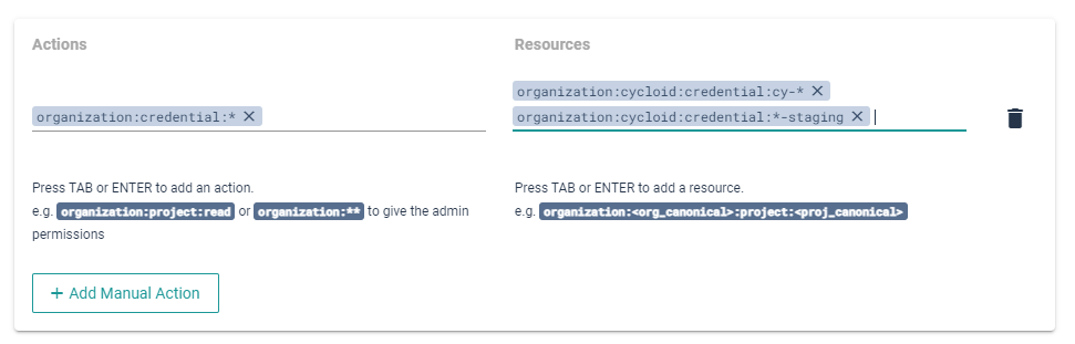 : Anything in between separator (:) (ex: organization:credential: allows all actions to credentials) : Anything skipping separator (:) (ex: organization: allows to do anything on the organization) So you can create something like: